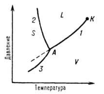 Рис. 1. Диаграмма состояния однокомпонентной системы. S, L и V - соответственно области существования твердой, жидкой и паровой фаз; 1, 2 и 3 - кривые кипения (испарения), плавления и возгонки (сублимации) соответственно, К - критическая точка; А - тройная точка.
