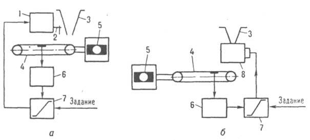 Рис. 4. Весовые дозаторы непрерывного действия с регулированием высоты слоя материала на ленте (а)и скорости потока материала (б): 1 - привод; 2 - заслонка; 3 - бункер; 4, 6 - силоизмерительные транспортер и преобразователь; 5 - электродвигатель; 7 - регулятор; 8 - питатель.