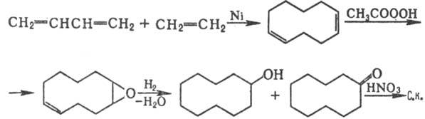 себациновая кислота можно получить также окислением циклодекана HNO3 или из 1,3-бутадиена и этилена по схеме: