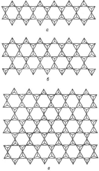 Рис. 5. Конденсация пироксеновых кремнекислородных анионов в ленточные двухрядные амфиболовые (а), трехрядные амфиболоподобные (б), слоистые тальковые и близкие им анионы (в).